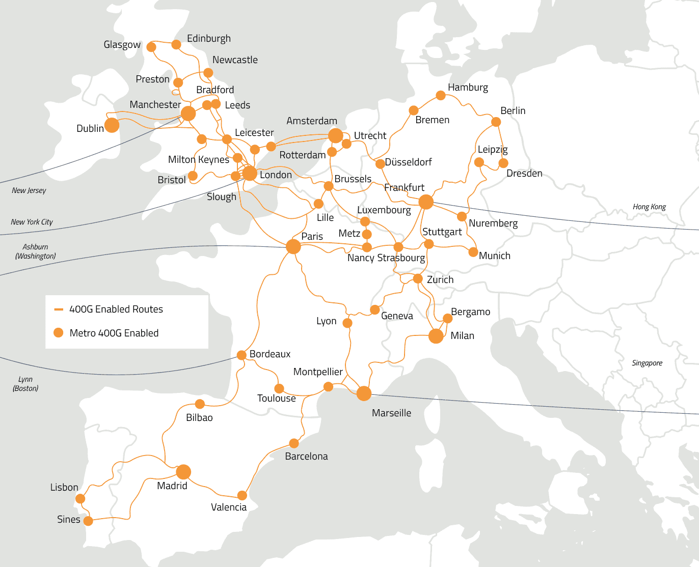 Our network includes extensive metro connectivity, lit and dark fibre solutions, and is 400G fully-enabled across our European Wavelength network. These fibre network global internet solutions empower you to reliably leverage new technologies that demand low-latency, high-bandwidth, scalability, and control.